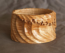 Rich Tannen’s maple milk-painted Container transforms a textured undulating surface into a three-dimensional form. Its asymmetric form is overlaid with precise rhythmic texturing. Like some forms found in nature, while externally free and irregular, they are built on a foundation of precise mathematical internal structure. |