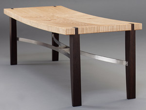 The five and one-half foot long wooden bench by James Schriber was a shortened version of a bench originally designed for public seating at a Yale University hospital. The slat-style cherry members of the bench’s top are nicely shaped for comfort, and the figured maple overlay on the long apron and legs effects an elegant style that goes well beyond the demands of public seating. This shortened version would make an entry way piece, but would also look quite in place at the foot of a bed. Viewed from above, the bench's long sides are slightly bowed as on a kayak. |