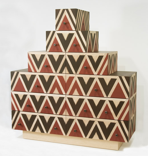 | Pyramid Chest by JUDY KENSLEY McKIE Carved and painted Basswood. 52”H x 48”W x 16.75”D |