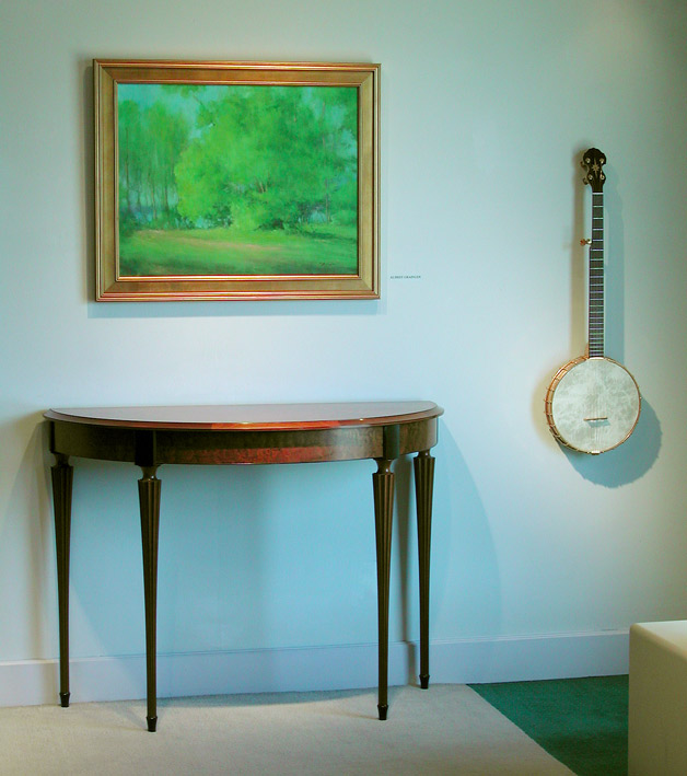 | Banjo Curly maple, snakewood, satinwood, ebony, bone, gold-plated brass. 38”H x 11.75”W x 3.5”D |