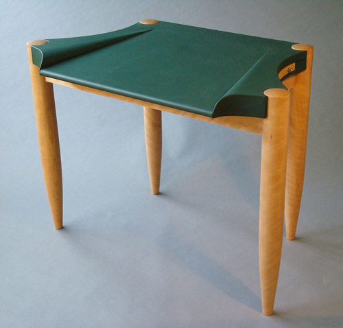 | Square Jester Table by TIM WELLS Maple, leather, lacquered steel. 35.5"H x 14.75”W x 14.75”D |
